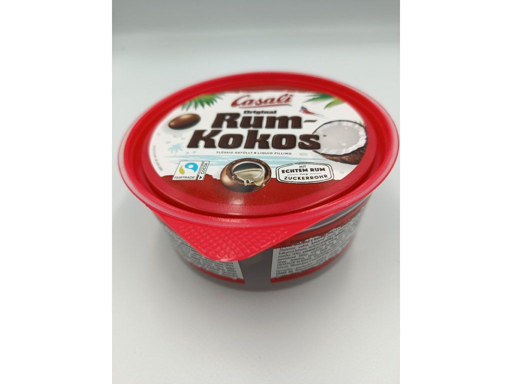 - Kokosovo-čokoládové dražé s rumovou náplňou (10%) máčané v horkej (9%) a v mliečnej čokoláde (59%) • Zloženie: cukor, kakaové maslo, SUŠENÉ PLNOTUČNÉ MLIEKO, kakaová hmota, SLADKÁ SUŠENÁ SRVÁTKA, kokosová múčka (4%), rum (4%), OVESNÝ PRÁŠOK, aróma, emulgátor: SÓJOVÝ LECITÍN, poťahové látky: arabská guma, šelak, glukózovo-fruktózový sirup, želatína, PŠENIČNÝ ŠKROB. MOŽE OBSAHOVAŤ STOPY ORECHOV. Skladujte na chladnom mieste, chráňte pred teplom. Krajina pôvodu: Rakúsko. Minimálna trvanlivosť do: pozri na obale.
